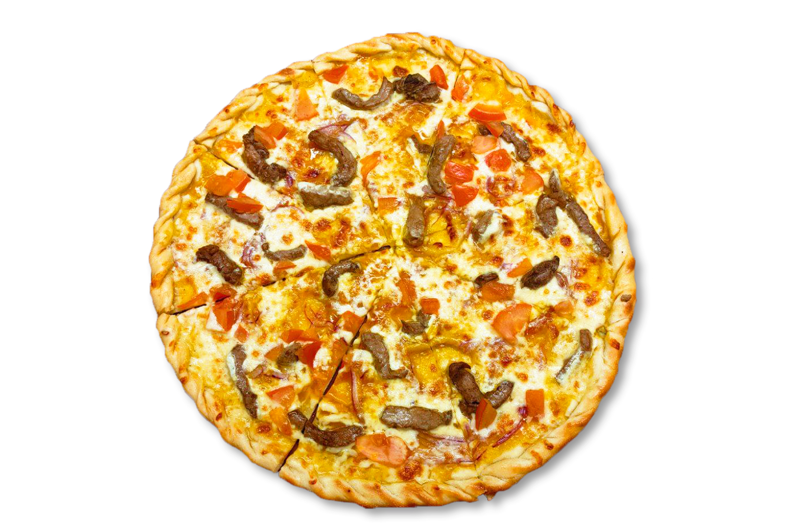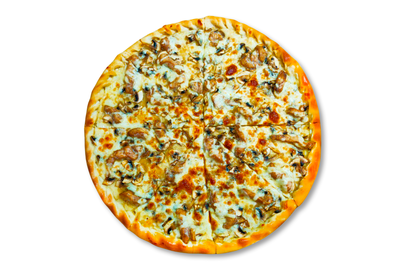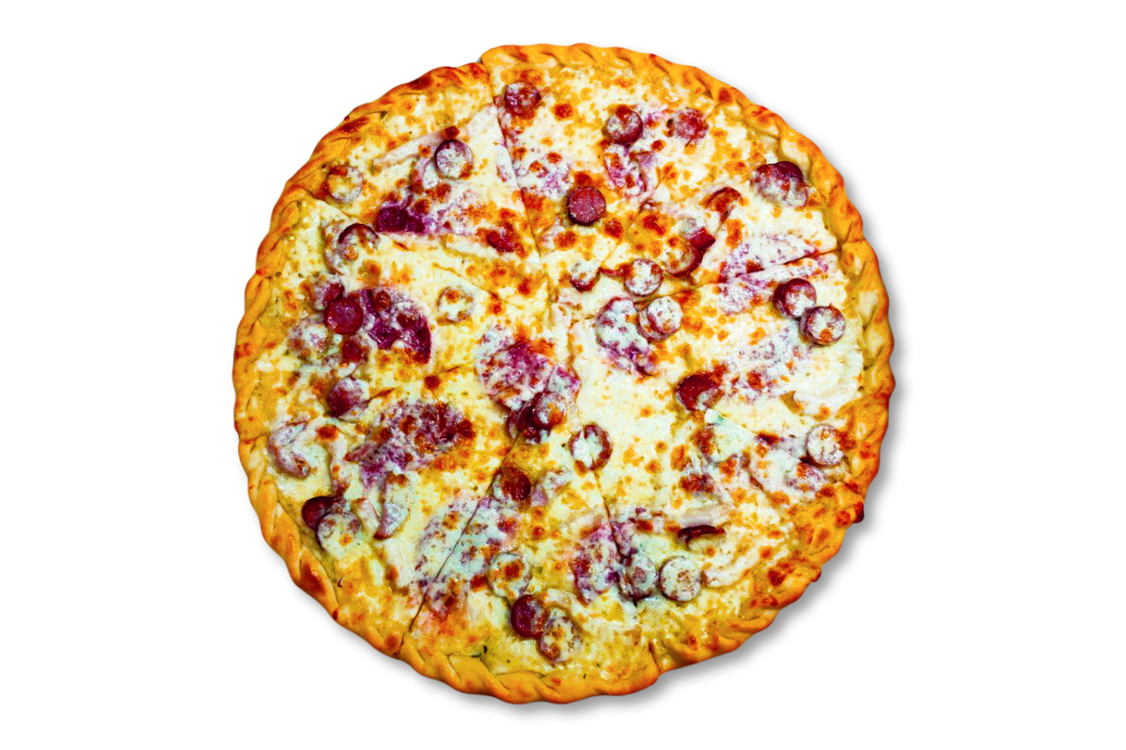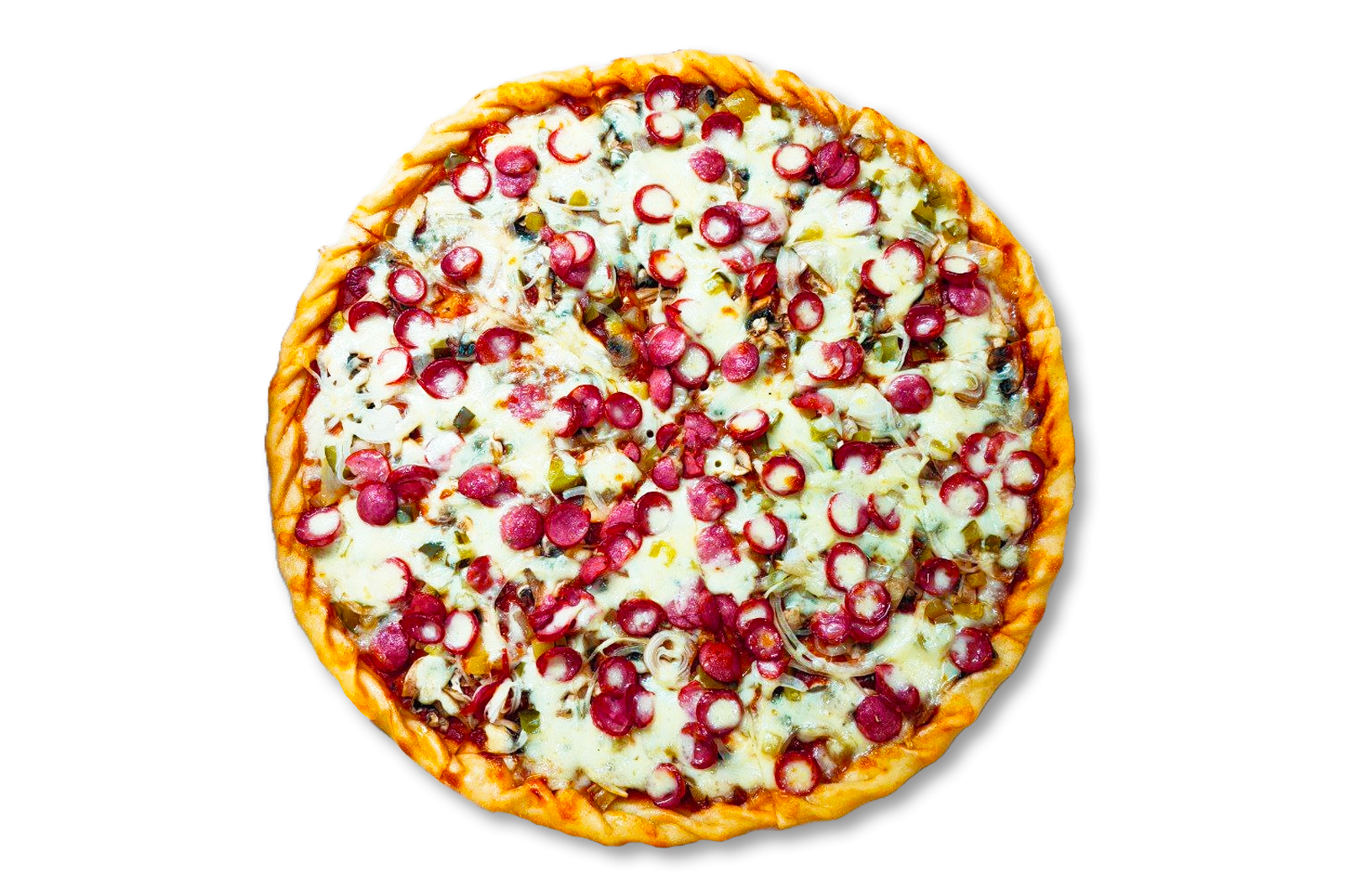 Мисливські ковбаски, моцарела, огірок солоний, печериці, цибуля, соус червоний
