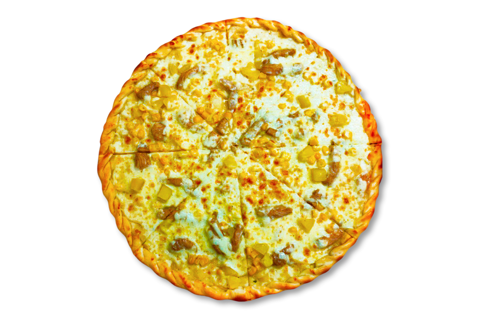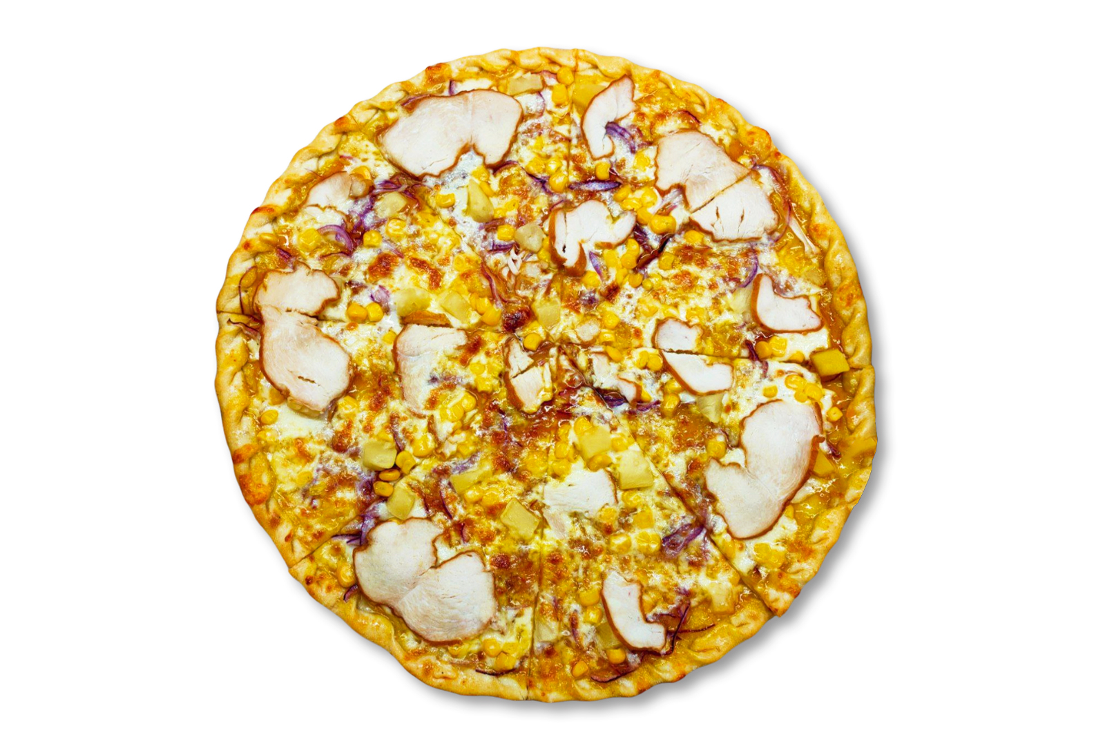 Філе курки копчене, моцарела, ананас, кукурудза, цибуля синя, соус кисло-солодкий