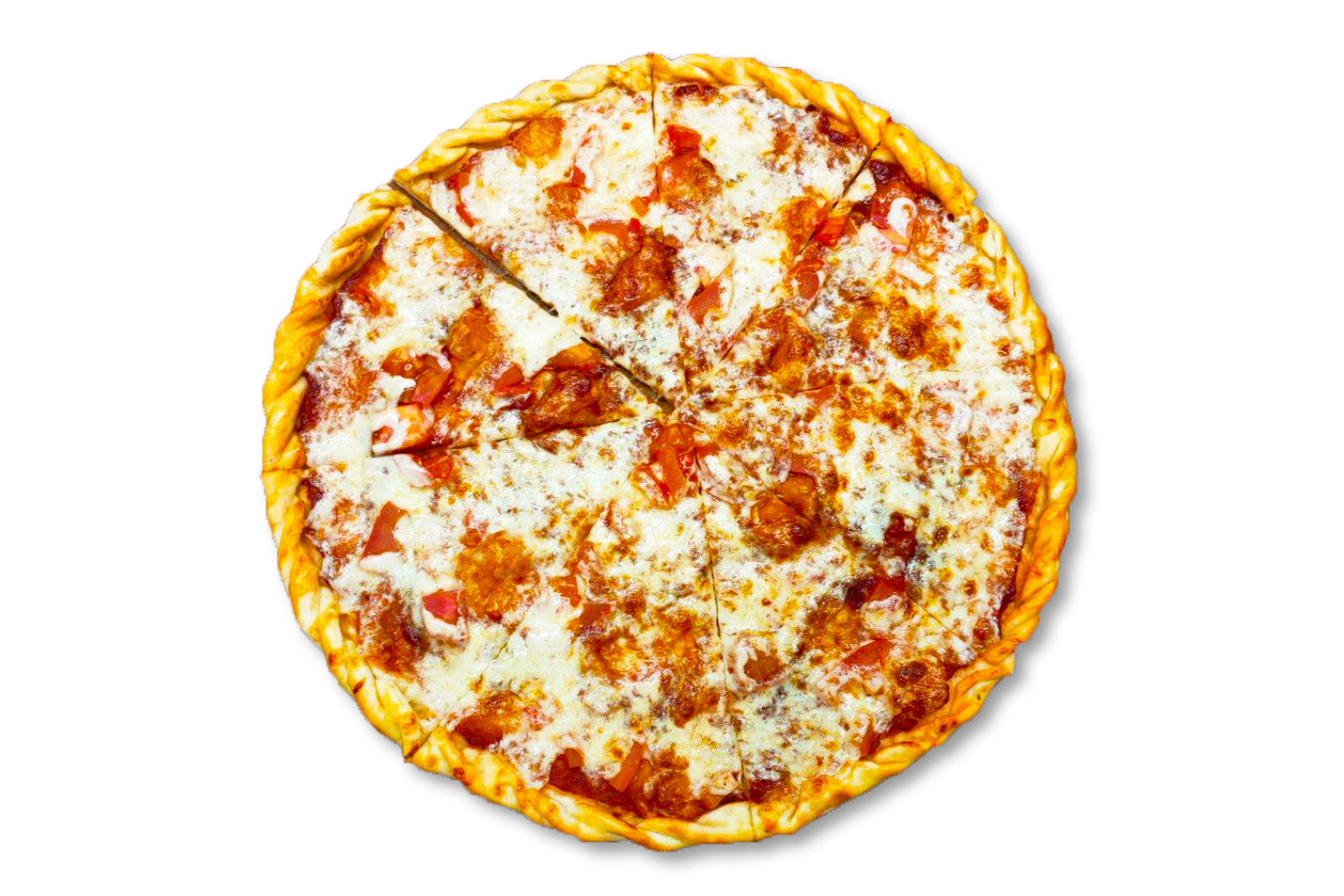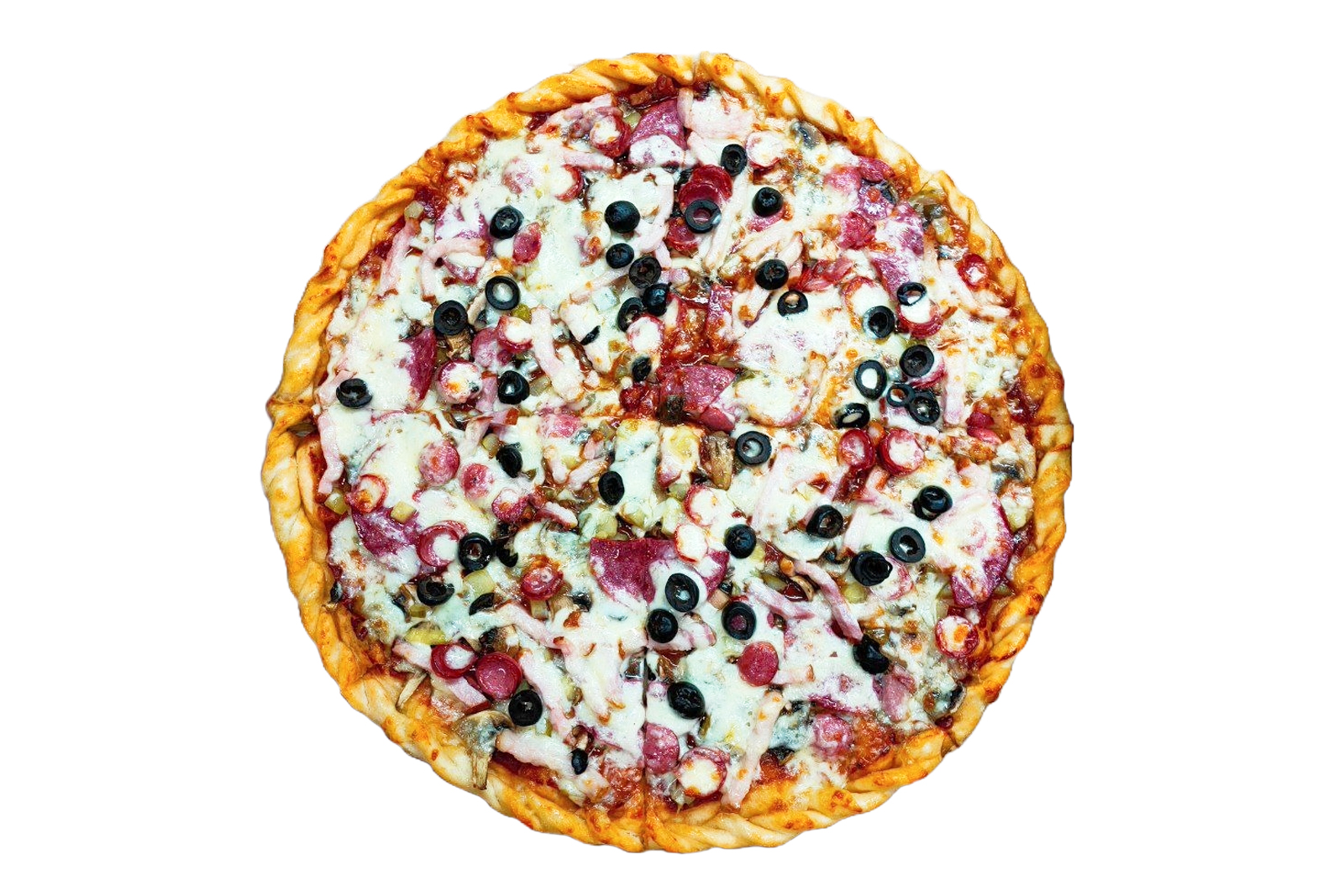 Мисливські ковбаски, салямі, бекон, моцарела, печериці, солоний огірок, оливки, соус червоний