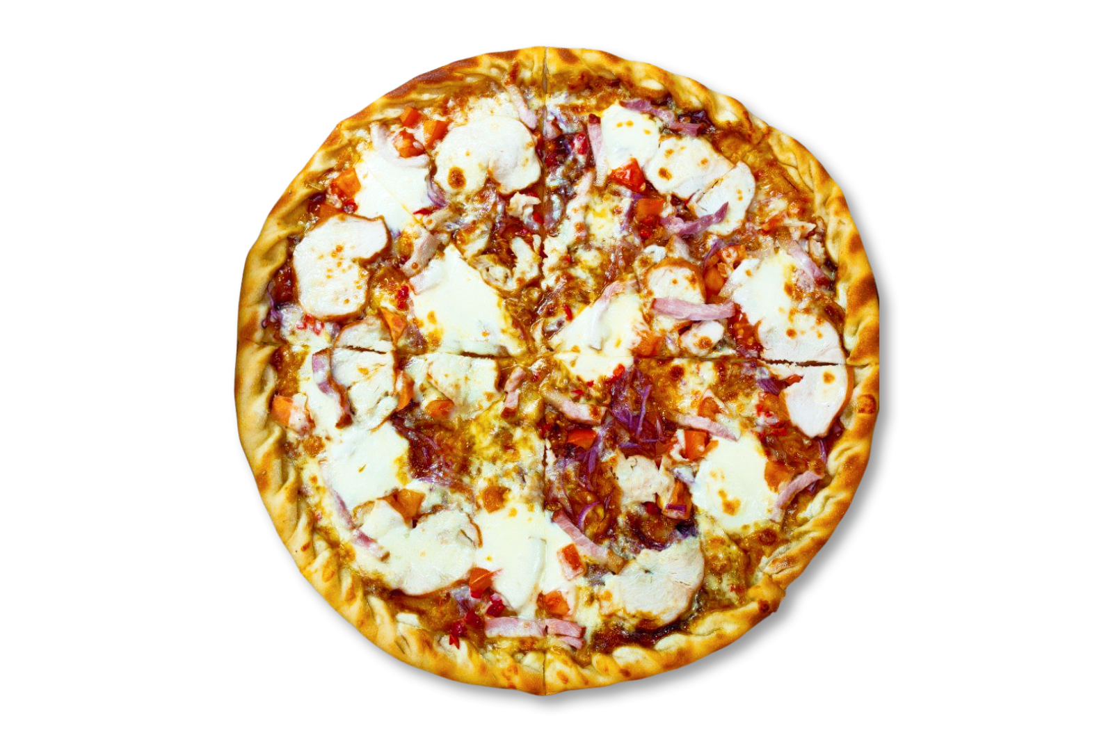 Бекон, філе курки копчене, моцарела, помідор, цибуля синя, перець чилі, соус барбекю, орегано, паприка