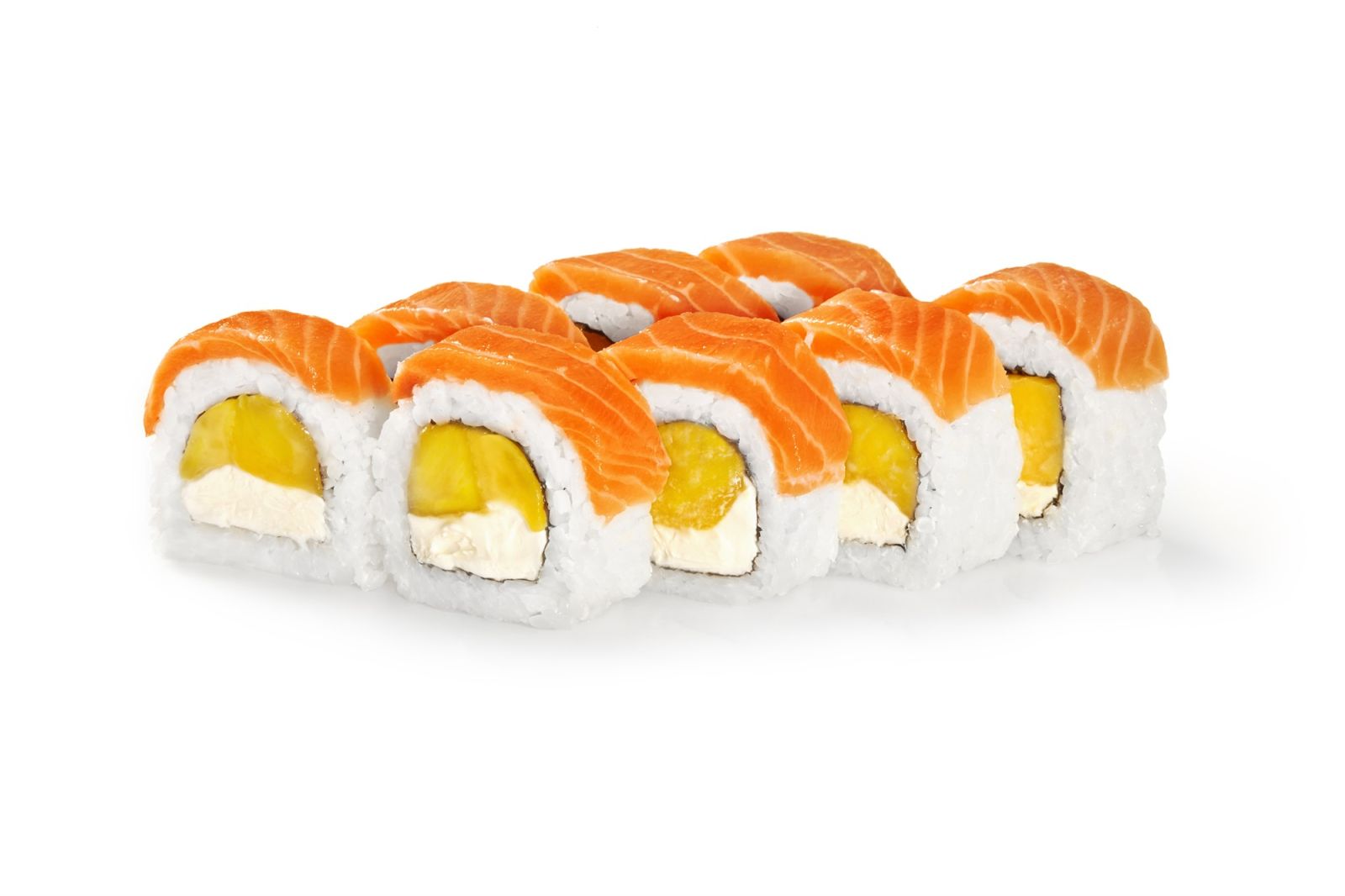 Рис, Норі, Філадельфія, Лосось жар, Цибуля зел, Соус спайсі, Огірок, Кунжут чб, Соус які